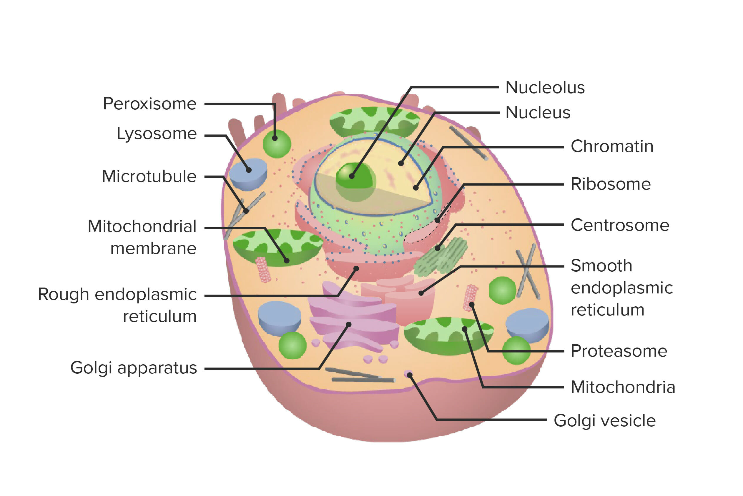 - Nucleus: The nucleus is the control center of the cell. It contains the cell’s genetic material (DNA) and is responsible for regulating gene expression and cell division.