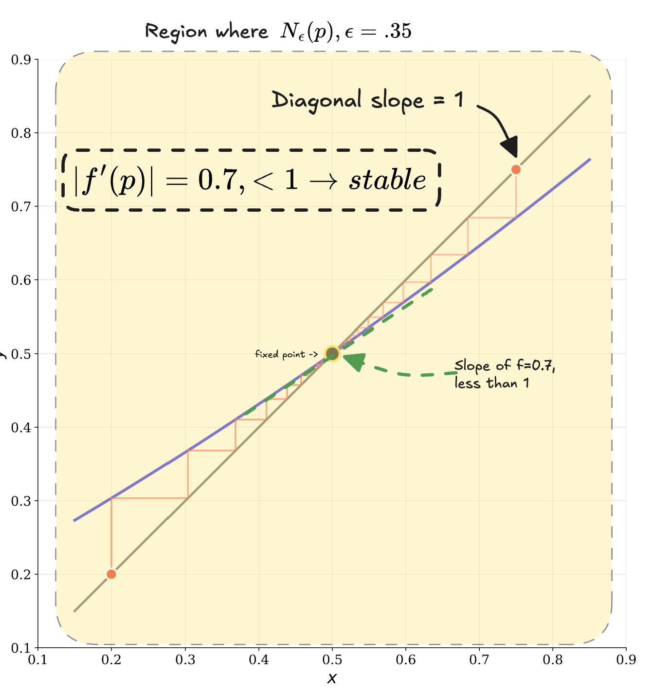In more words and less notation: provided remains between the lines and in the epsilon neighborhood of , all points in the neighborhood are in the basin of . This question is deeper than you may think at first, and showing your condition works for a single example is not proving that it works for all example functions f . Your condition needs to work for all f .