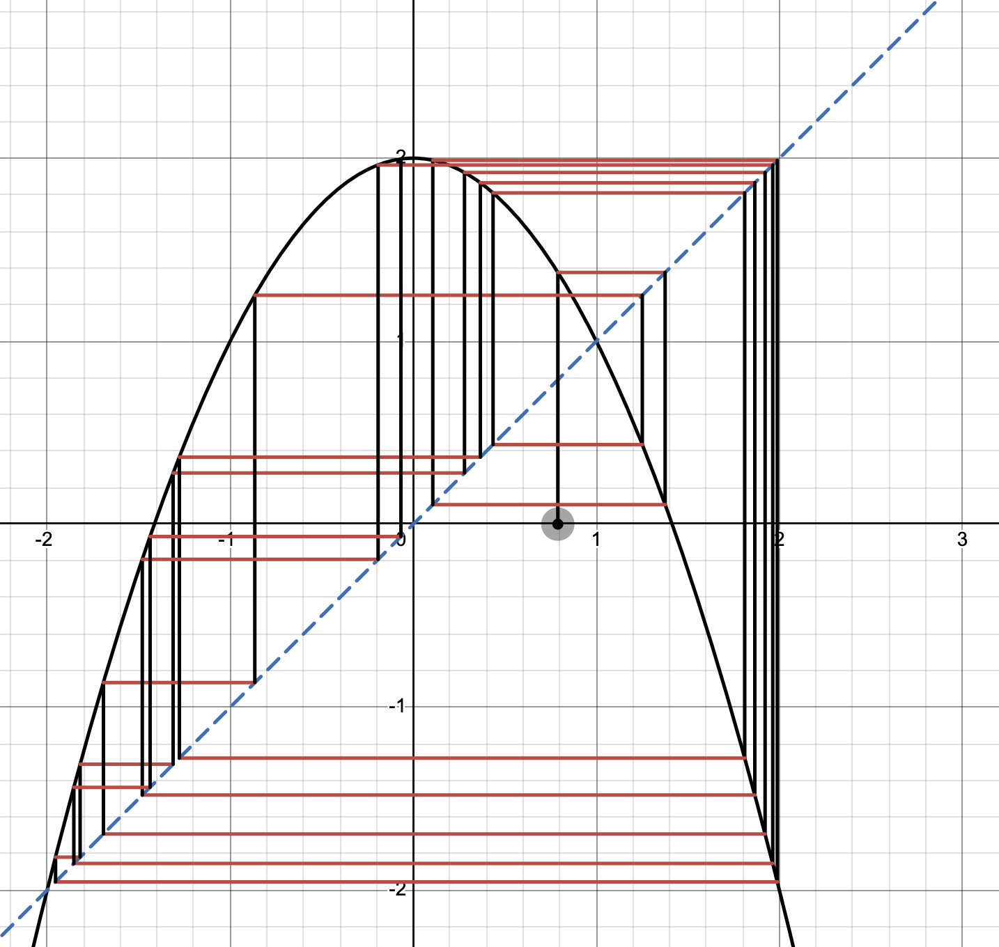 . downward parabola, vertex at , roots at . desmos graph shows chaotic behavior everywhere except 1 ( on rough explorations ). Bounded between -2 and 2.