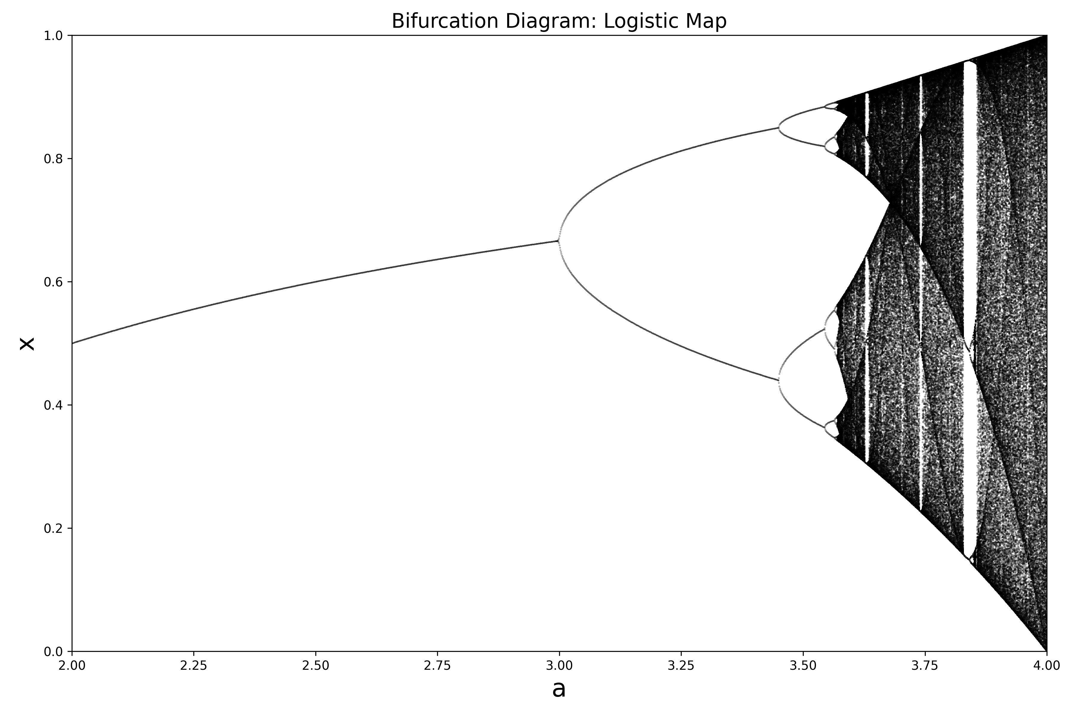 (a) Write a program to draw the bifurcation diagram for the logistic map for in increments of . Iterate times from a random . Plot the bifurcation diagram.