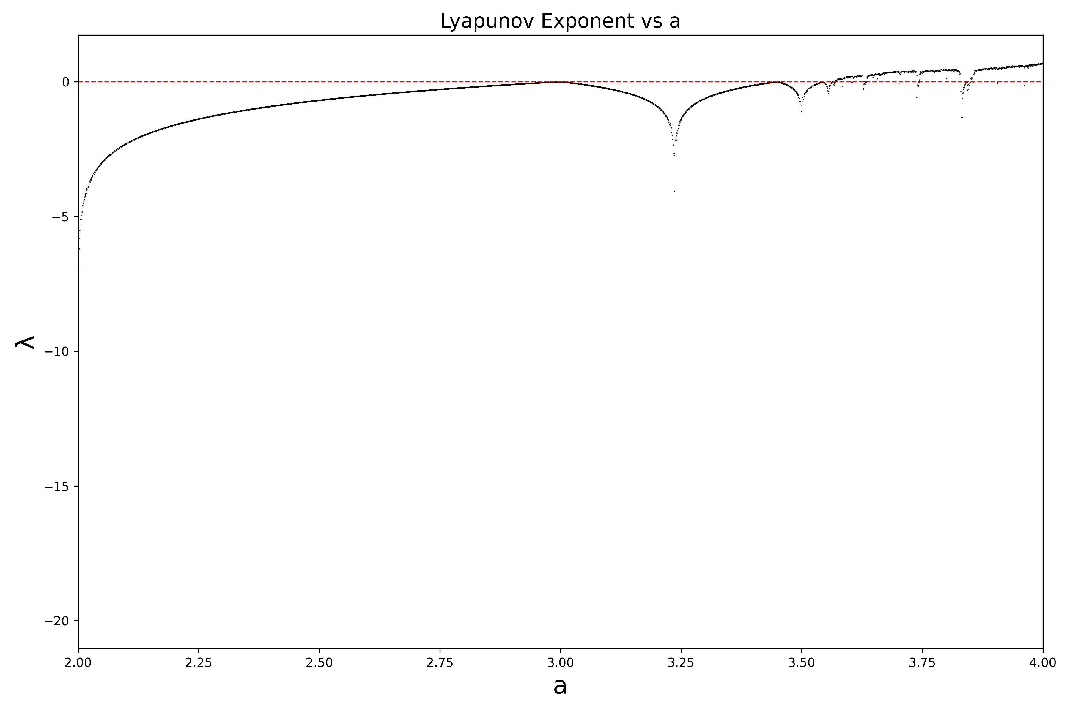 periodic windows in the chaotic regime (e.g. the period-3 window near ) show up as sharp dips of below zero in the lyapunov plot.