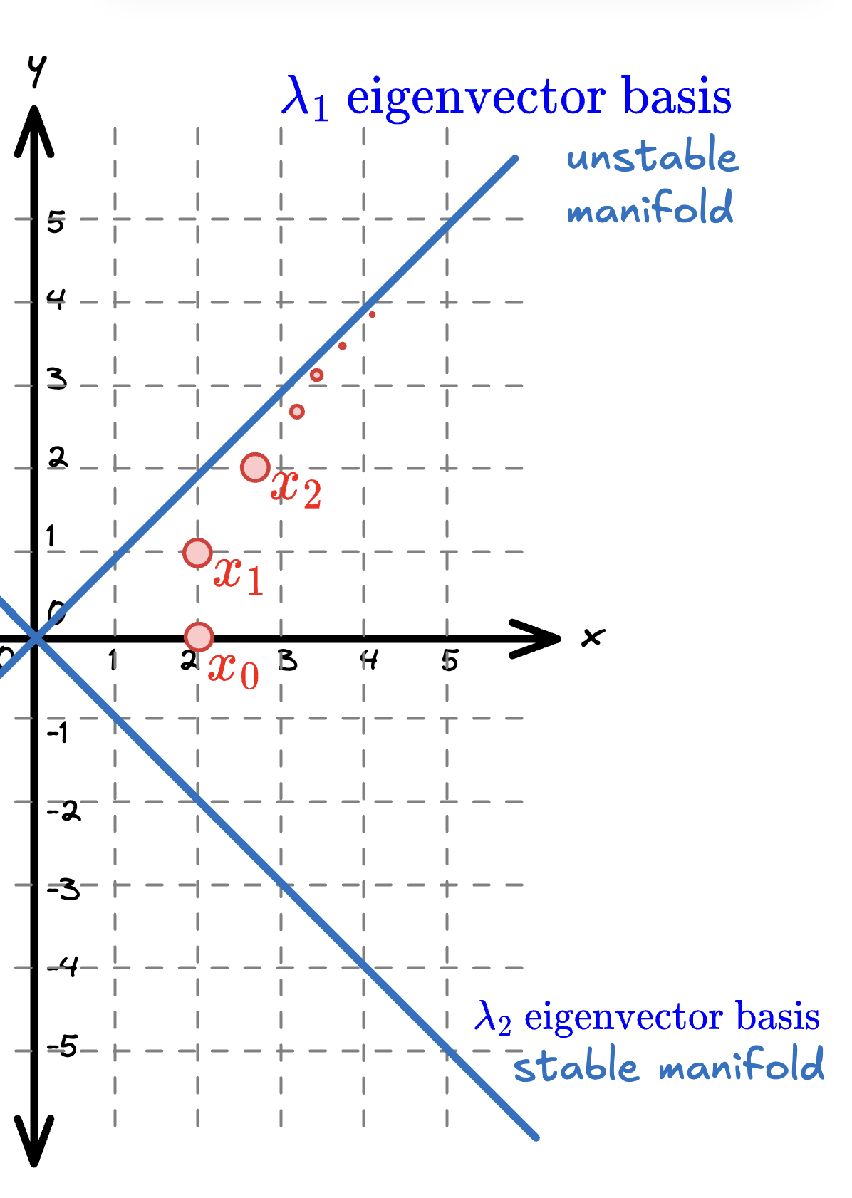 Starting from , successive iterations climb along the eigenvector direction (unstable manifold). Since , points expand along this direction. The eigenvector basis forms the stable manifold - points on this line contract toward the origin since .