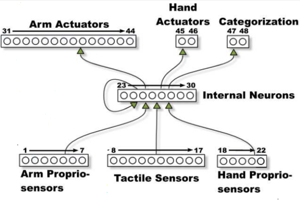A CTRNN-controlled agent is evolved to perform active categorical perception on objects it cannot directly “see”, it must develop a motor strategy that produces informative sensory signals. The evolved behavior often looks like poking or circling, generating a sequence of sensor readings that encodes object geometry.