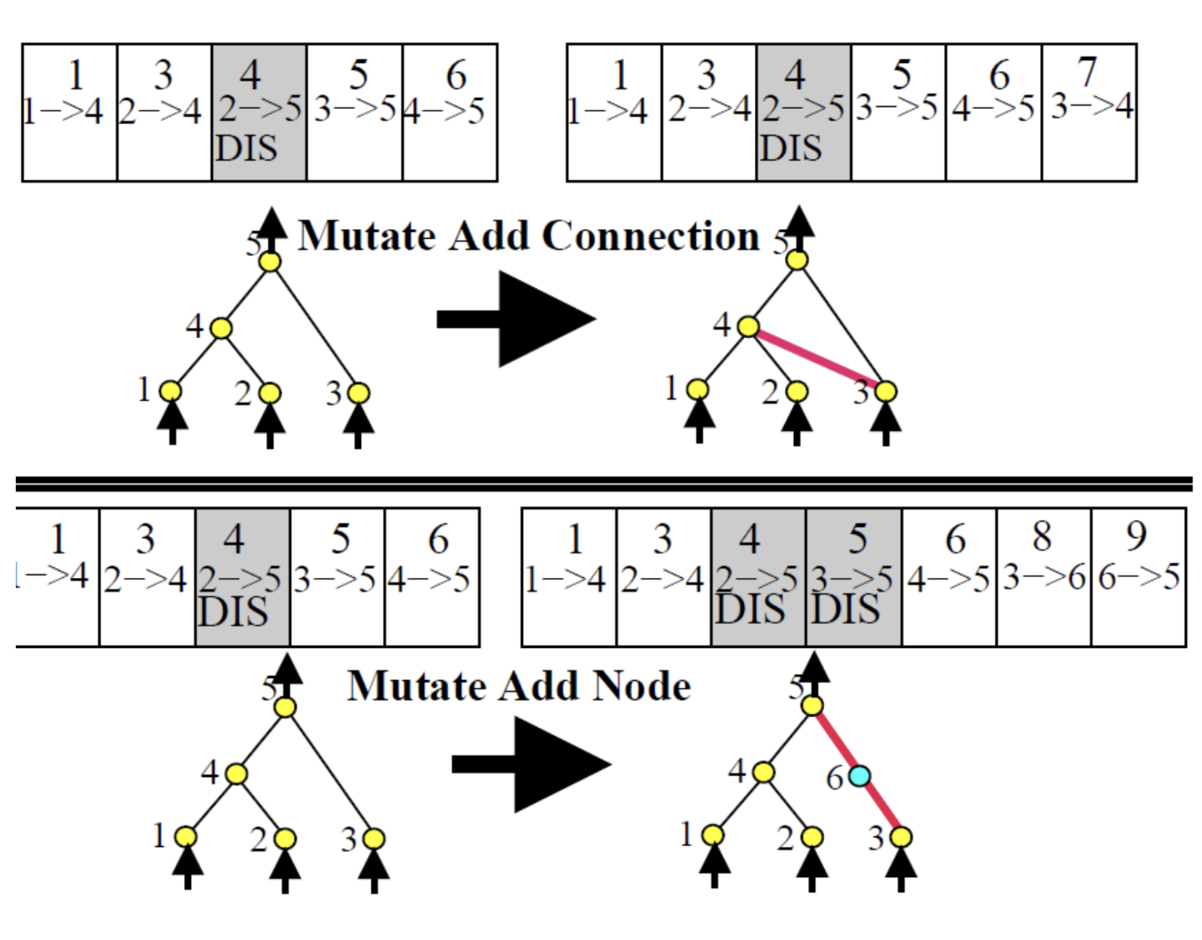 Add node: an existing synapse is split. The old connection is disabled, and two new connections are added — one from the original source to the new node (weight 1), one from the new node to the original target (inheriting the old weight). The old connection gene stays in the genome, just disabled.