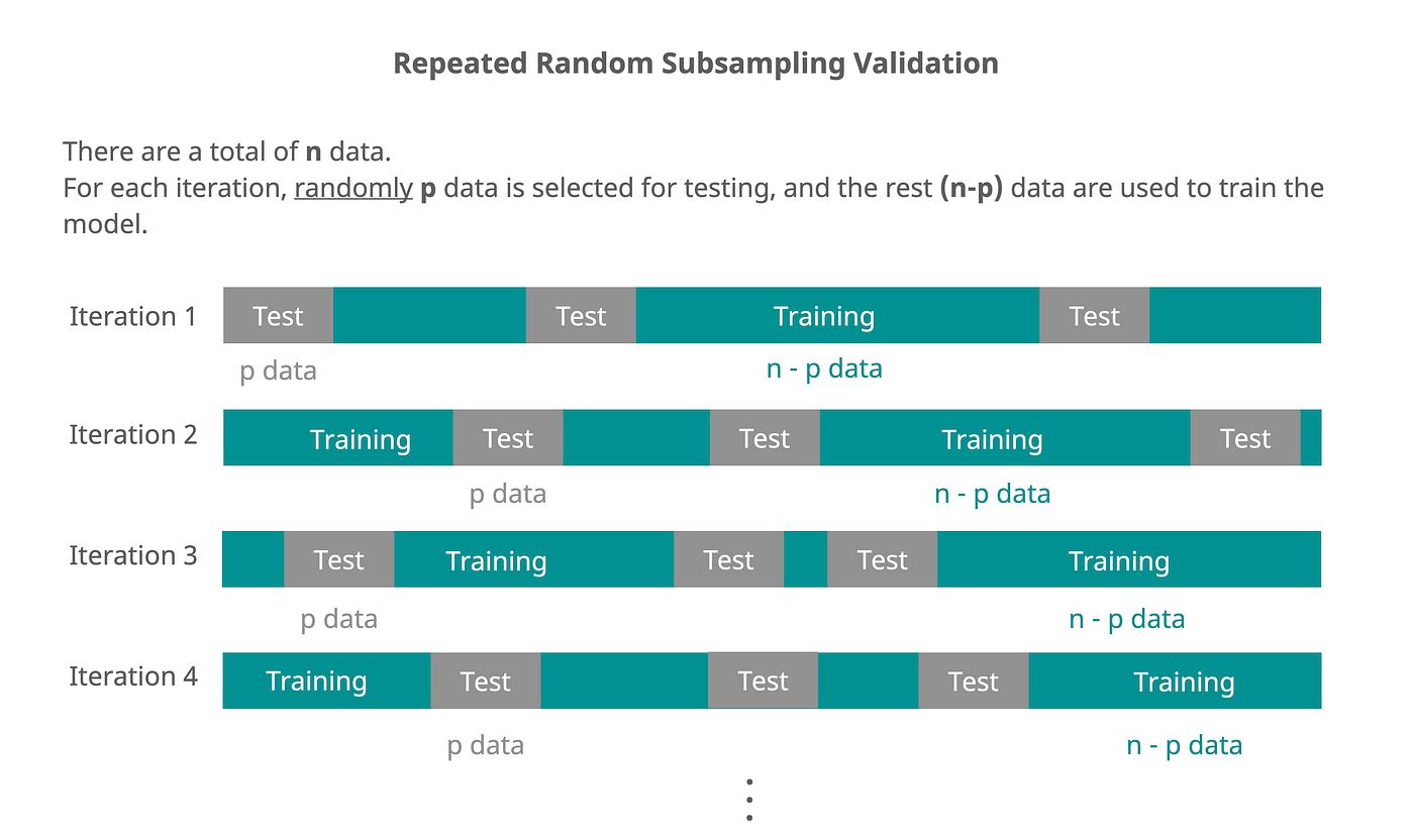 Also known as Monte Carlo cross-validation, this method involves randomly splitting the dataset into training and testing data multiple times. Each time, a model is trained on the training set and evaluated on the test set. The results are then averaged to provide an overall performance estimate.