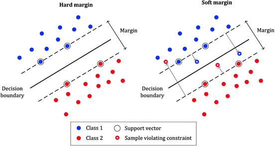 Soft margins are more flexible, allowing some data points to be within the margin or even misclassified. This is achieved by introducing slack variables that quantify the degree of misclassification for each data point.