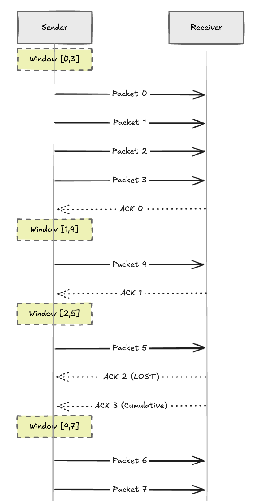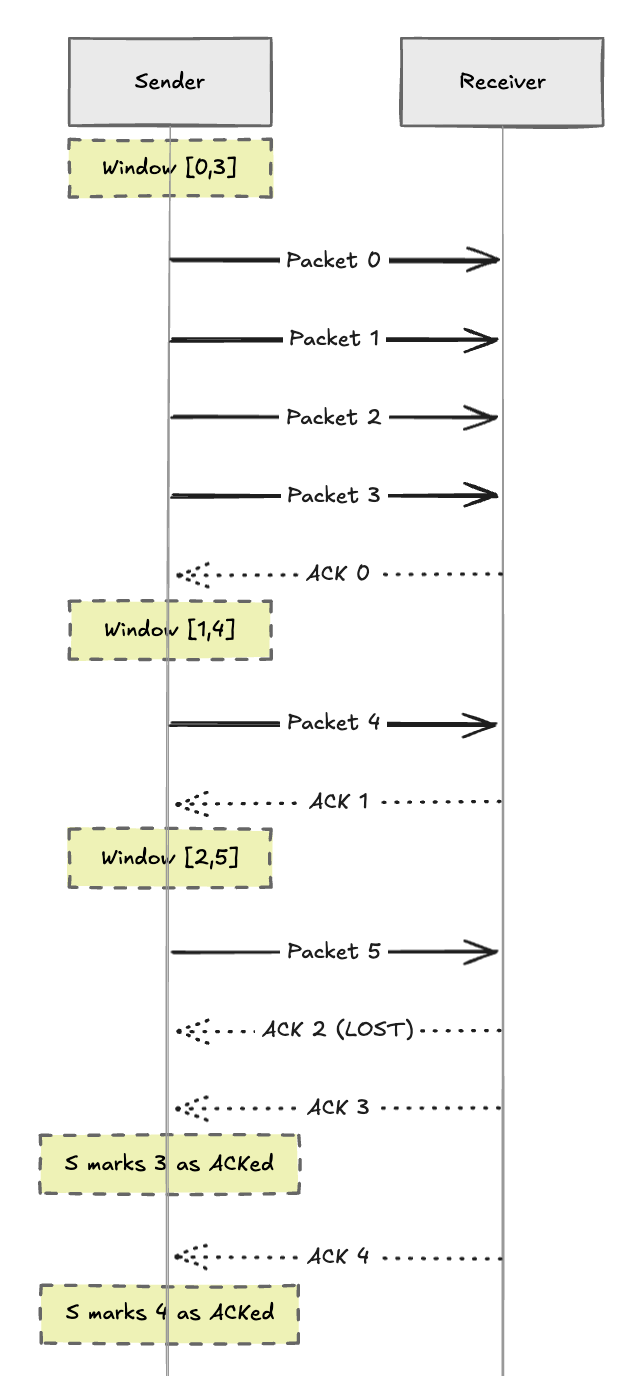 - sender sends 0, 1, 2. receiver delivers and sends ACK 0, 1, 2. receiver window slides to [3, 0, 1].