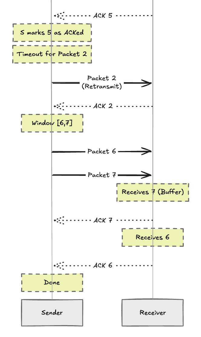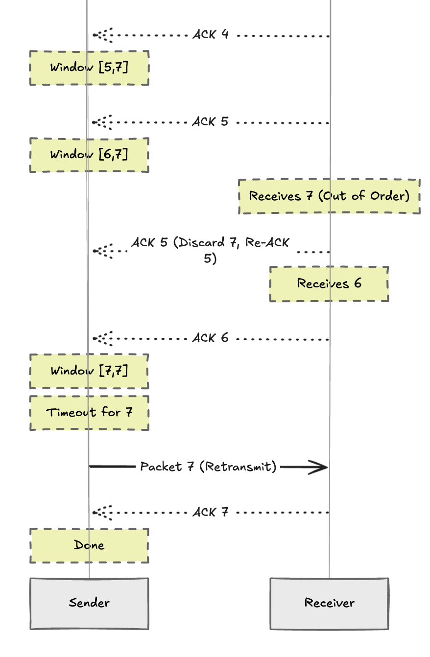 we see cumalative acks, ACK 2 lost howevr ACK 3 arrives, thus sender slides window past 2. when 7 arrives before 6, receiver discards 7 and re ACKs 5.sender times out on 7 and retransmits.