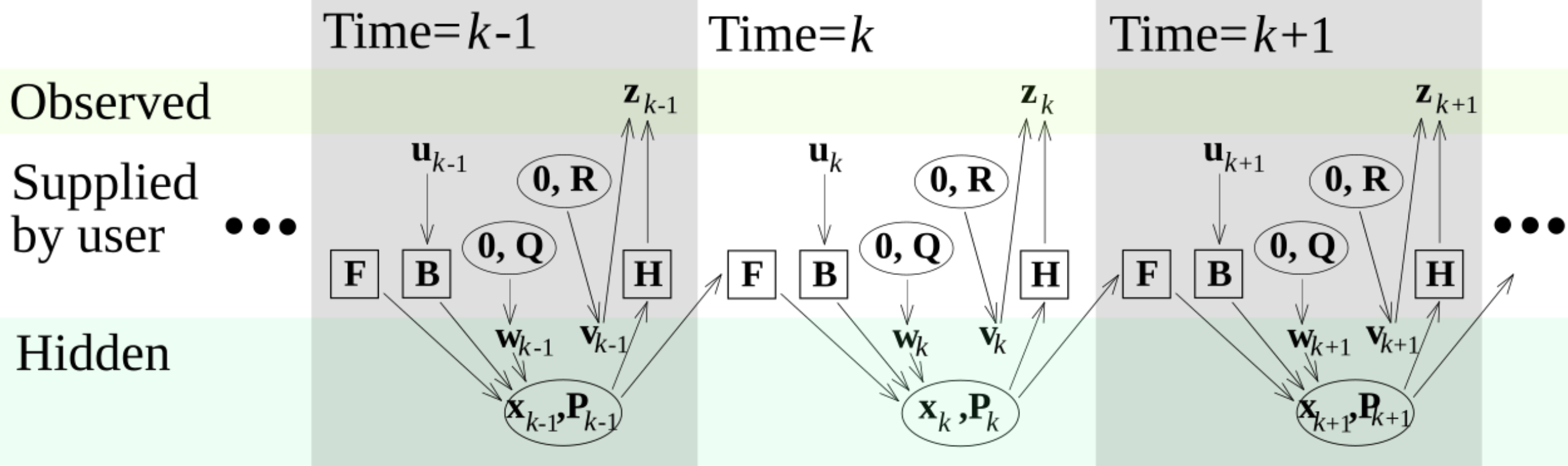 Model underlying the Kalman filter. Squares represent matrices. Ellipses represent multivariate normal distributions (with the mean and covariance matrix enclosed). Unenclosed values are vectors. For the simple case, the various matrices are constant with time, and thus the subscripts are not used, but Kalman filtering allows any of them to change each time step.