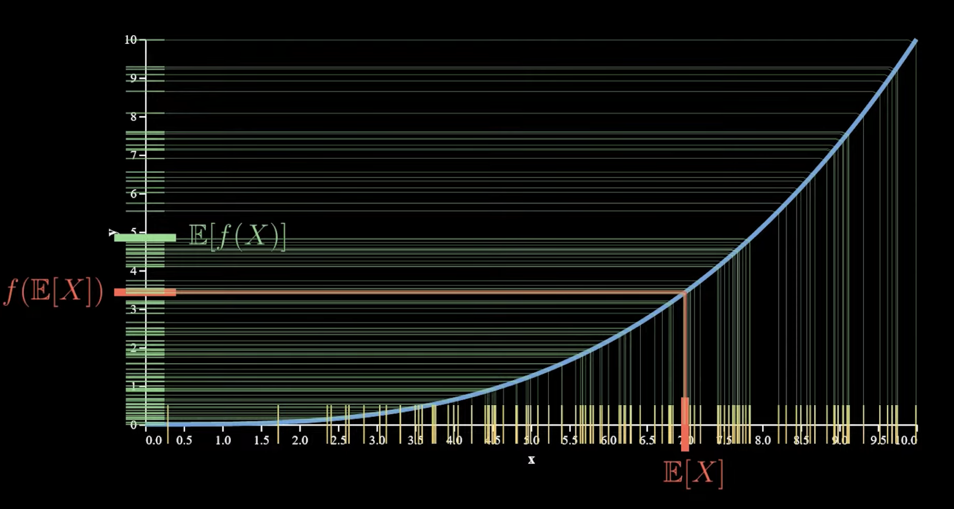 Imagine drawing a straight line connecting two points on a curved “smiley face” graph. For a convex shape, the straight line connecting two points always sits above the curve itself. The weighted average of the function values is greater than the function of the weighted average.